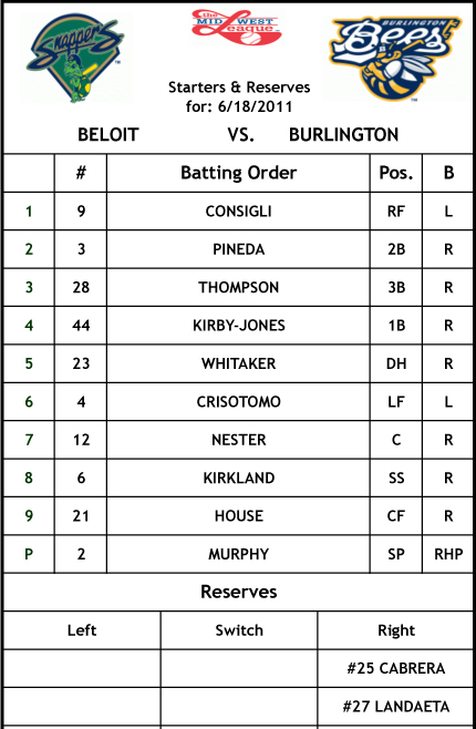 The Burlington Bees (45-23) and the Beloit Snappers (36-32) play the second game of their three-game series this afternoon at 2 p.m. at Community Field in the final home stand before the Midwest League All-Star Game in Davenport, Iowa on Tuesday, June 21 at 7:05 p.m. RHP Sean Murphy makes his first start of the season for the Burlington Bees today. Murphy, who had one “spot start” in Stockton on June 12, spent the majority of this season in the Oakland A’s Extended Spring Training program. Burlington 3B Tony Thompson scored the tying run on a passed ball and hit a walk-off home run to left field to lead the Bees over the Snappers by a score of 5-4 in 11 innings at Community Field Friday night.