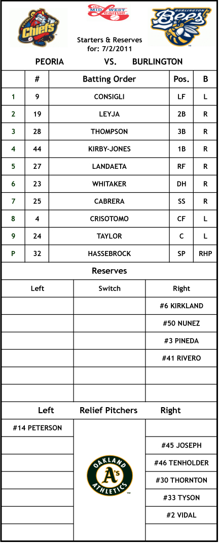 The Burlington Bees (4-4) and the Peoria Chiefs (2-6) wrap up their three-game series tonight at 6:30 p.m. at Community Field. RHP Matt Loosen (1-0, 2.25) gets the start for Peoria against RHP Blake Hassebrock (4-3, 1.69) for Burlington. The Bees have a record of 9-3 in games played against the Chiefs this season and are 36-21 against right-handed starting pitchers. Hassebrock has an overall record of 2-2 to go along with a 1.29 ERA in games played at Community Field and allowed one run on six hits in his last start on June 27 against Kane County.