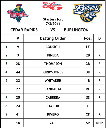 The Burlington Bees begin a brief three-game road swing here in Cedar Rapids against the Kernels today. The Bees just finished a six-game home stand against Kane County and Peoria, winning three and losing three. Last night the Bees lost 5-1 to the Peoria Chiefs one night after amassing a season high 18 runs and 18 hits in an 18-4 victory. Even though the Bees offense put up one run on six hits Saturday, the offense has been very good in the second half. SS Wade Kirkland (3-7) is batting .429 in the last 10 games, sparked by his 2-3 performance against Kane County on June 28. IF Ryan Pineda has seen more time at second base and it has translated into a .364 average (4-11) in his last 10 games.