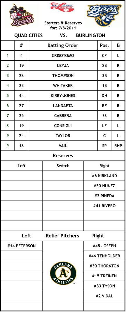 The Bees lost to the River Bandits by a score of 7-6 at Community Field Thursday night. Burlington scored four runs over the eighth and ninth innings, but fell just short of the victory. The River Bandits started the scoring in the top of the first inning after CF Michael Swinson (3-4) hit a lead-off, solo home run to right field for a 1-0 lead. In the top of the third inning, Quad Cities SS Ronny Gil (1-4) singled on a ground ball hit to Bees 3B Wade Kirkland and advanced to second base on a wild pitch. An RBI single from DH Oscar Taveras (2-4) put the River Bandits up 2-0. Bees CF Jose Crisotomo (2-4) led off the bottom of the third inning with a double and scored on a two-out single by RF Josh Whitaker (2-4) to make the score 2-1. After a one-out single to center field by Quad Cities RF Nick Longmire (2-5), C Cody Stanley (0-4) flied out to left field and Longmire advanced to second base. 3B Victor Sanchez (0-4) reached first base on a throwing error by Bees SS Yordy Cabrera. With 2B Packy Elkins (0-3) at the plate, Burlington RHP Blake Hassebrock (4-5) threw a wild pitch and Longmire scored to give the River Bandits a 3-1 lead. In the top of the fifth inning, Taveras reached first base on a fielder’s choice. 1B Jonathan Rodriguez (1-4) was hit by a pitch and Taveras advanced to second base. A single by LF Chris Edmondson (1-5) moved Taveras to third base and Rodriguez to second base. Longmire hit a two-RBI single to right field to put the River Bandits up 5-1. Elkins walked to start off the top of the sixth inning, and scored on a triple to center field by Swinson. An RBI single to right field by Taveras scored Swinson to make the score 7-1. Burlington C Beau Taylor (2-4) hit a RBI single to left field in the bottom of the sixth inning, which drove in 1B A.J. Kirby-Jones (0-4) to make the score 7-2. In the bottom of the eighth inning, Whitaker hit a solo home run to center field to get Burlington within four runs at 7-3. After a single by Taylor to lead off the bottom of the ninth inning, Kirkland walked. A triple to right field by Crisotomo scored Taylor and Kirkland. A sacrifice fly by 2B Nino Leyja (0-4) plated Crisotomo to make the score 7-6. Hassebrock allowed five runs on eight hits, walked one and struck out two in five innings of work and earned the loss. RHP Zack Thornton pitched three innings, allowed two hits, two runs, walked two and struck out three. RHP Blake Treinen finished the game by throwing the final frame in his first appearance at home.