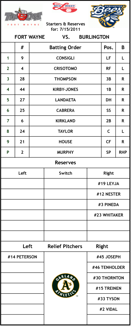 The Burlington Bees (7-13) and Fort Wayne TinCaps (8-12) finish a three-game series tonight at Community Field. RHP Zach Cates (3-5, 4.81) makes his 17th professional start for the TinCaps this evening. Cates last pitched against the Dayton Dragons on July 7 and allowed one earned run on six hits in five innings to pick up a win. He was drafted by the San Diego Padres in the third round of the 2010 draft out of Northeast Texas Community College, where he was recruited as a catcher and didn’t pitch full-time until 2009. He only started pitching because he dislocated three fingers on his left hand. Cates was rated the No. 21 prospect in the Padres organization by Baseball America going into this season.