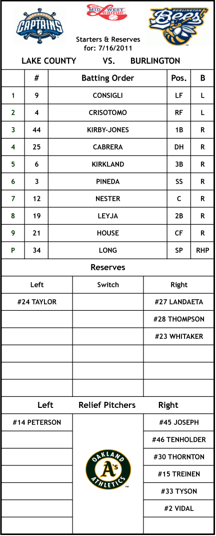 The Burlington Bees (7-14) and Lake County Captains (8-13) begin a three-game series tonight at 6:30 p.m. at Community Field. The Captains are the 2010 Midwest League Champions. The only other time the Bees and Captains have met was last season at Classic Park, located in Eastlake, Ohio, where the Bees took two of three. The Captains are the Midwest League Affiliate of the Cleveland Indians.