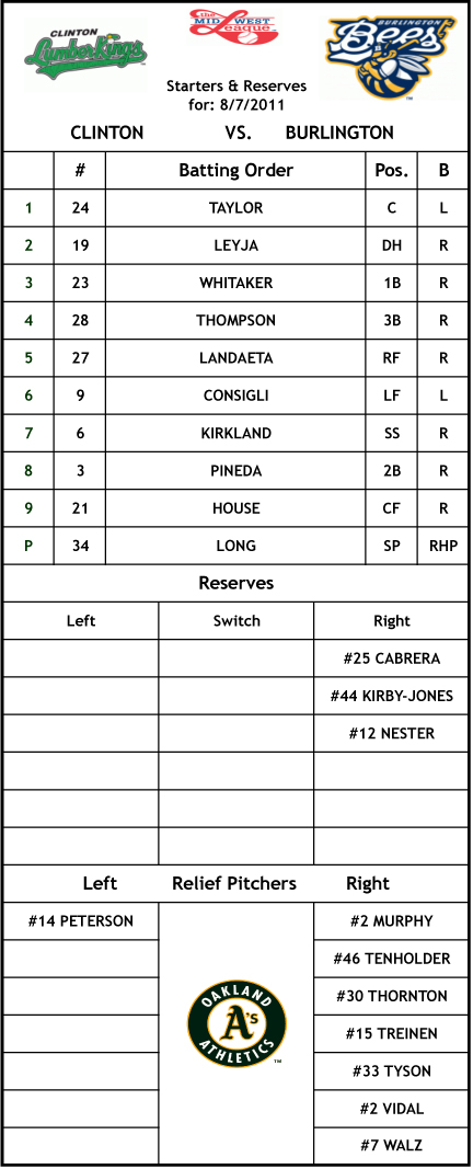 The Bees scored six runs over the first three innings to secure an 8-4 win over the Clinton LumberKings before 1,197 fans at Community Field on Saturday night in the opening game of a four-game series. Clinton scored a single run in the top of the first inning against Burlington RHP Jonathan Joseph (3-4). CF Mike McGee (1-4) doubled and scored on a triple by 2B Stefen Romero (1-4) for a 1-0 lead. Burlington scored four runs in the bottom half of the first inning against Clinton LHP Tony Butler (1-2). DH Ryan Pineda (1-4) doubled and LF Royce Consigli (0-3) walked. 1B Josh Whitaker (1-3) singled to load the bases. 3B Tony Thompson (1-3) doubled both Pineda and Consigli across home plate and pushed Whitaker to third base. RF Douglas Landaeta (1-3) lifted a sacrifice fly to left field to score Whitaker. Thompson scored on a throwing error by Butler in an errant pick-off attempt to make it 4-0. 2B Nino Leyja (2-4) hit a solo home run over the left field wall in the bottom of the second inning to make it 5-0. Clinton scored a run in the top of the third inning on a solo home run by LF Julio Morban (3-4) to shave the lead to 5-1. In the bottom of the third inning, Thompson lifted a sacrifice fly to center field to score Whitaker and make it 6-2. The LumberKings scored single runs in the fifth and eighth innings to get the score to 6-4. CF Tyreace House (2-4) added a two-run single in the bottom of the eighth inning to increase the Burlington lead to 8-4. RHP Jonathan Joseph pitched five innings for the win. RHP Blake Treinen tossed two scoreless innings, and RHP Pedro Vidal pitched two scoreless innings for his second save of 2011.