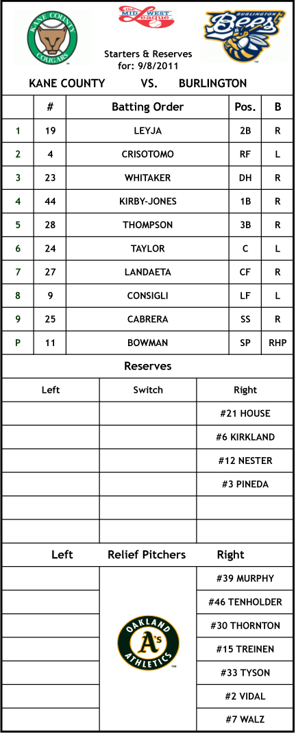 RHP Josh Bowman gets the start for the Burlington Bees in game two tonight. He pitched two scoreless innings in a start against Cedar Rapids on September 4 in his final “tune up” before the playoffs. Bowman’s last start against Kane County was a loss back on July 11. He allowed six earned runs on 10 hits in six and one-thirds innings pitched at Elfstrom Stadium. He is 8-6 with a 3.55 ERA in 2011.